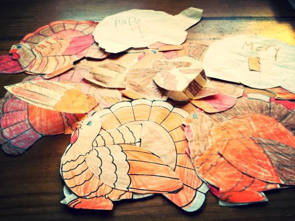 Thanksgiving was a big deal when we were kids. It was hosted every year at my grandparent’s or our house. There'd be as many as 25 or 30 people crowded around a make-shift table made of plywood and sawhorses that was laden with a huge turkey, stuffing, mashed potatoes, sweet potatoes, cranberries, gravy, jello and cottage cheese salad, break-apart rolls, celery sticks, Uncle George’s pickles and black olives from a can. Gina and I would make little decorations for the table, like pilgrim's hats or name cards with turkey hands. It was all very Norman Rockwell.